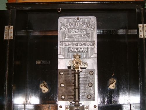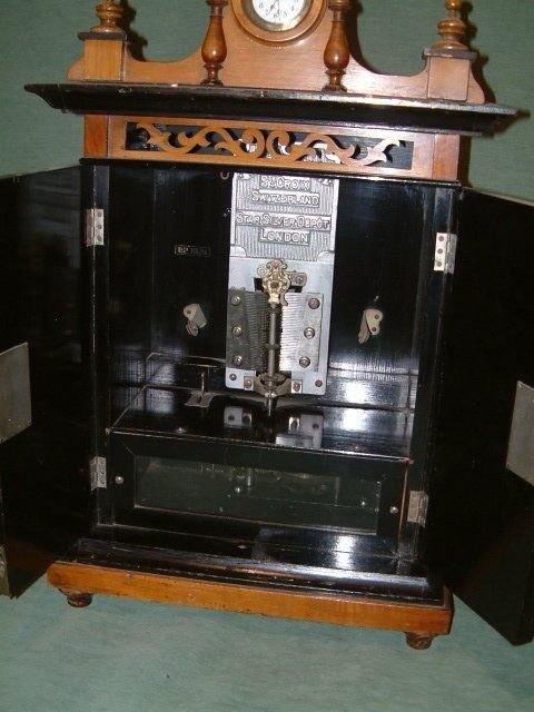Edwardian Walnut Britania 9" Disc Music Box with Transfer Door Panels. Known as the Smokers Cabinet with Clock and Crossbanded Dooor Panels restores Movement works plays perfectly all teeth sound. with at least 1 disc, beautiful tone.